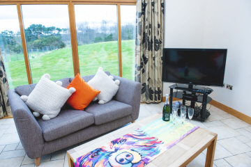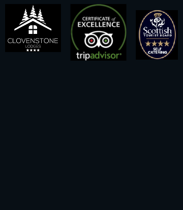 Then continue uphill for about ¾ mile and follow road around natural bend. Turn first left through farm gates into driveway of Clovenstone Lodges and continue to lodge.
